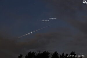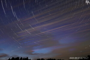 Jeden sporadyczny, a drugi to typowy Perseid. Co prawda oba celowały w radiant, ale ten u góry poleciał ku Perseuszowi. Taki jakby Anty-Perseid. Zaś ten właściwy zaznaczył długi na dziesięć stopni ślad o zróżnicowanej jasności. Nocka początkowo dawała nadzieję na więcej uciechy, ale jeszcze przed północą niebo zaciągnęło się chmurami. No cóż, pozostaję z aparatem na statywie w gotowości.