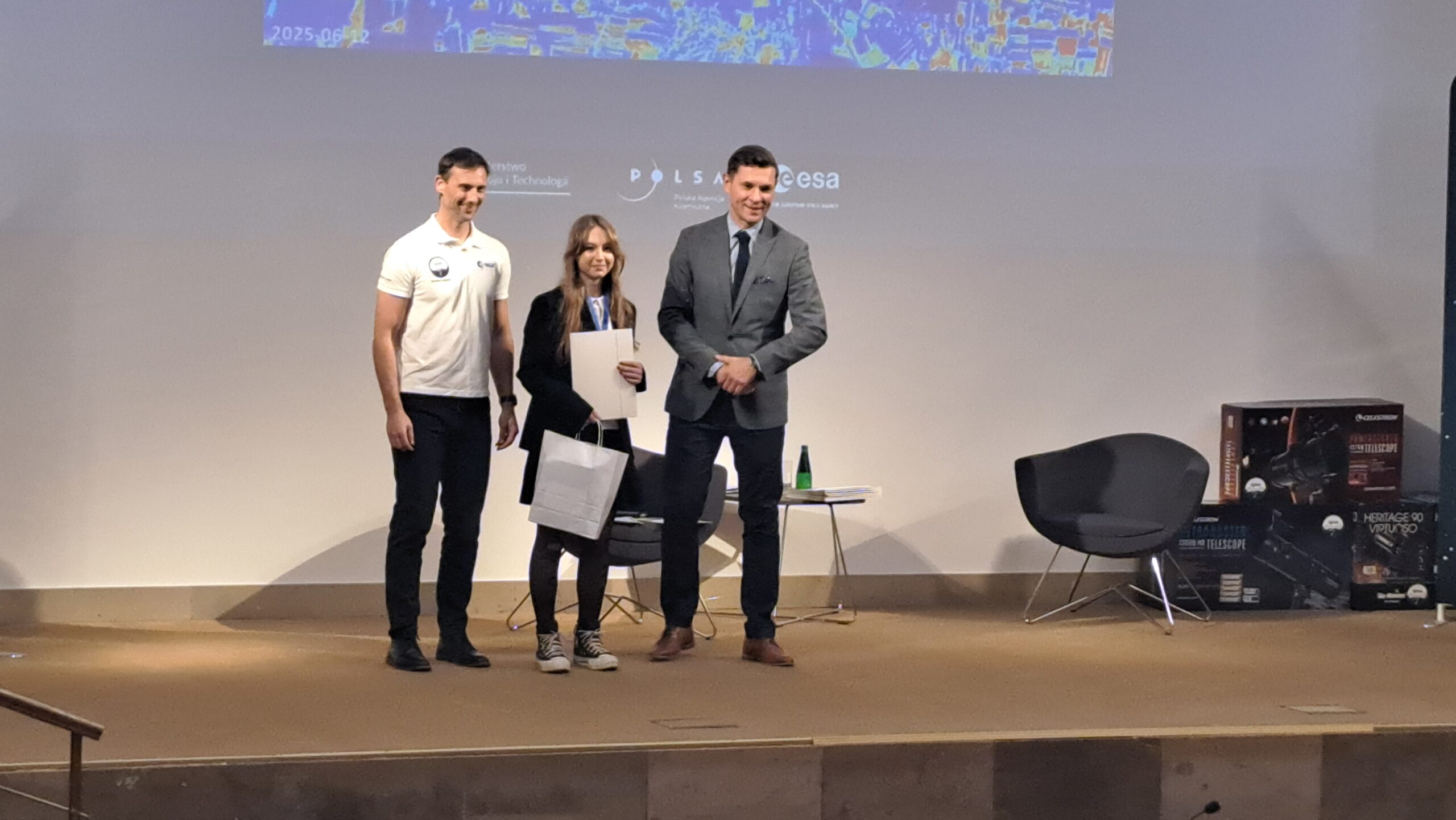 W zeszłą środę (24.09.2025) miałam okazję uczestniczyć w uroczystej gali finałowej konkursów towarzyszących misji IGNIS. Wydarzenie odbyło się w Ministerstwie Rozwoju i Technologii w Warszawie i zostali na nie zaproszeni wszyscy laureaci pięciu konkursów organizowanych przez Polską Agencję Kosmiczną. Udało mi się zdobyć wyróżnienie w jednym z tych konkursów – „Z góry widać więcej”, w którym zadaniem była analiza i interpretacja danych satelitarnych.